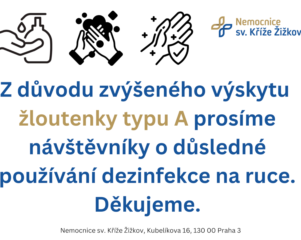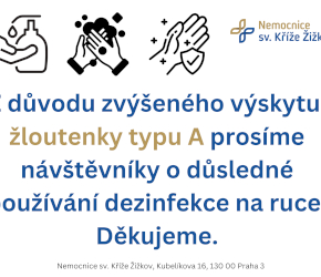 Novinky Ambulantní centrum, lůžková oddělení, RTG a SONO, lékarna.Nejen pro Prahu 3. Aktuality Prosíme o důsledné dodržování hygieny rukou V Praze řádí žloutenka typu A. Dbejte prosím na hygienu a u nás v nemocnici využívejte dezinfekci na ruce. Děkujeme!Publikováno: 30. 10. 2025 Fotogalerie